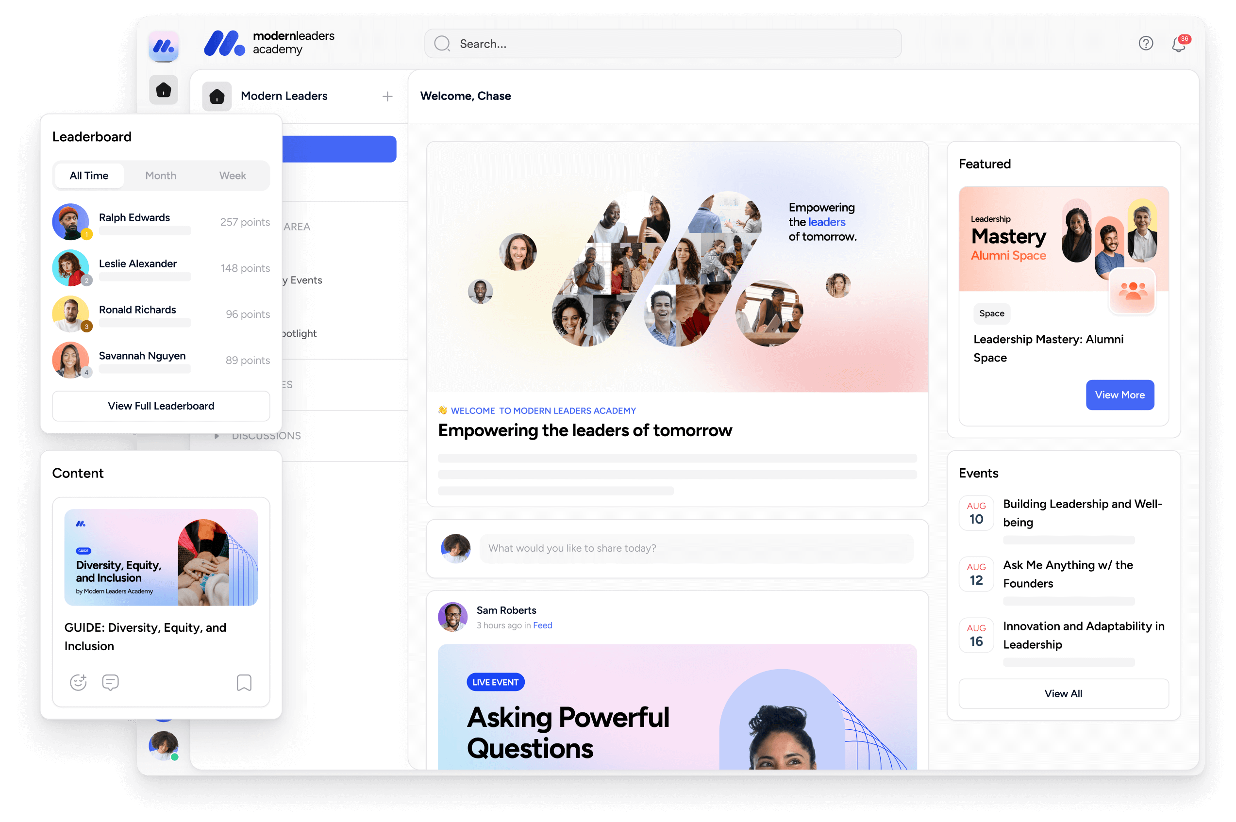| Event reminders | Surfaces upcoming live sessions, deadlines, and scheduled events | Reduces no-shows and keeps participants on track |
